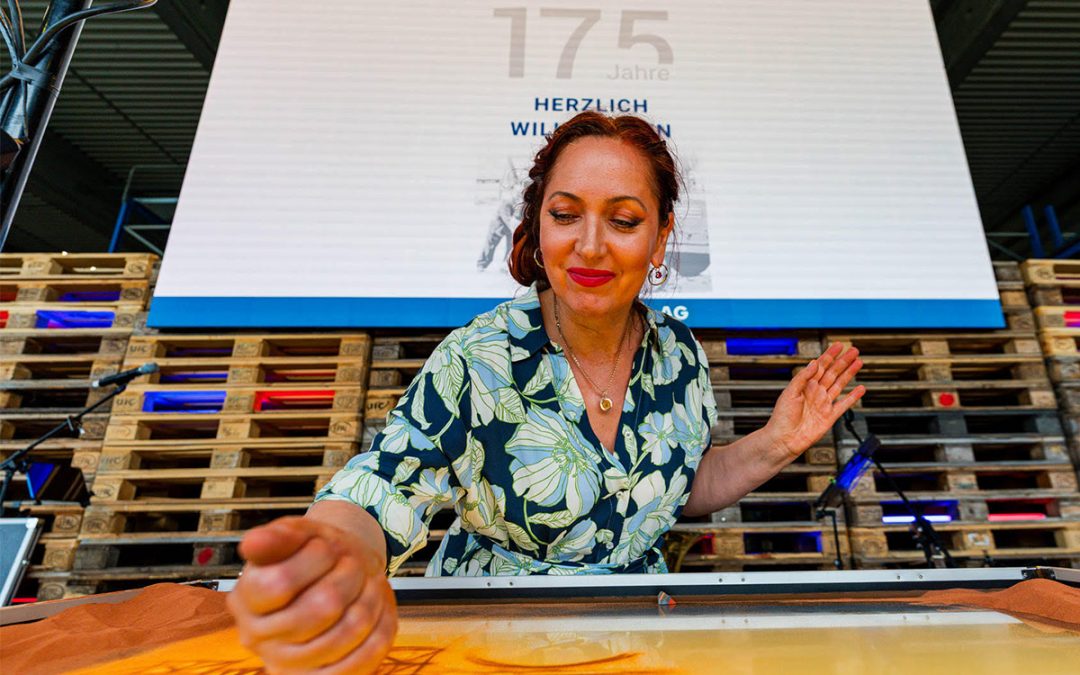Die-Künstlerin-Alla-Denisova-beim-Sandmalen Sep. 10, 2025 Die Künstlerin Alla Denisova beim Sandmalen